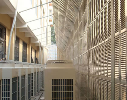 空調(diào)機(jī)組聲屏障材質(zhì)選擇:聲屏障的地上部采用金屬板,具有耐候性、耐老化、經(jīng)濟(jì)耐用??垢g材料;聲屏障的地下部分即基礎(chǔ)則以混凝土及鋼材為主,并需要斜支撐來加固穩(wěn)定性。